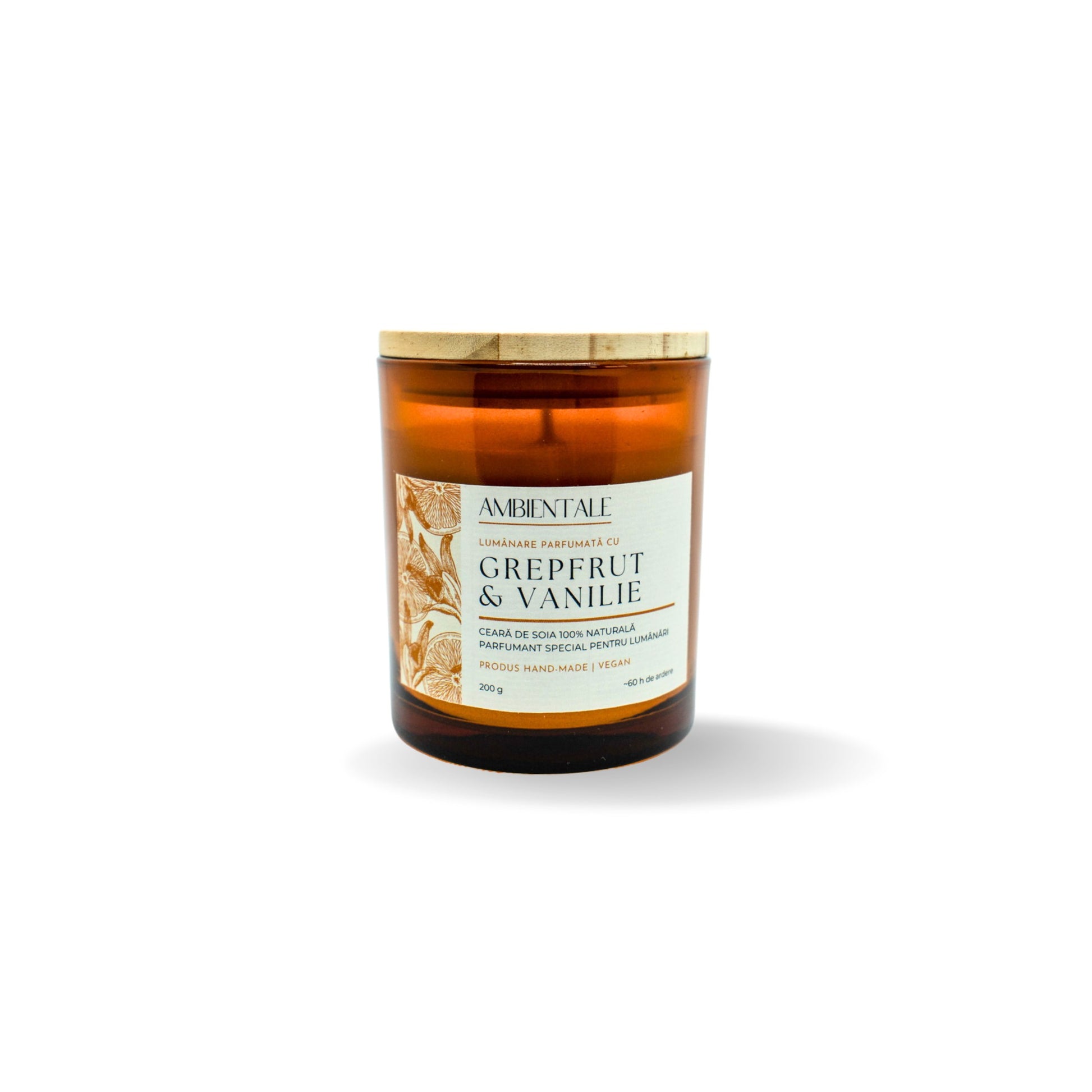 Descoperă lumânarea AMBIENTALE parfumată cu grepfrut și vanilie, un amestec echilibrat între eleganță și naturalețe. Fabricată din ceară de soia 100% naturală, această lumânare turnată manual are un parfum încântător de grepfrut, cu note stabilizatoare de vanilie.